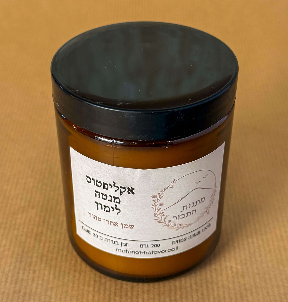 נר כרמל הינו חלק מהסדרה האתרית שלנו - נרות עם שמנים אתריים טהורים. הנר עשוי בעבודת יד, משעווה צמחית 100% על בסיס סויה וקוקוס, ללא תוספת פראפין, עם ריכוז גבוה במיוחד של בלנד שמנים אתרים איכותיים של אקליפטוס, מנטה ולימון. ללא בישום מלאכותי כלל.. הריח המיוחד נותן ניחוח פירותי קליל ורענן, ומשרה אוירה אביבית. הנר בעל פתיל רחב כפול העשוי מעץ טבעי - נותן אפקט של בעירת עץ, עם צליל קל של פצפוץ המזכיר מדורה. משקל התכולה 200 גרם, משך הבעירה: כ 30 שעות.